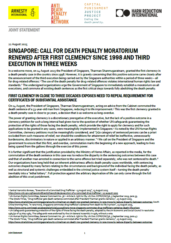 In a welcome move, on 14 August 2025 the President of Singapore, Tharman Shanmugaratnam, granted the first clemency in a death penalty case in the country since 1998. However, it is gravely concerning that this positive outcome came closely after the announcement of the third execution being carried out by the Singapore authorities within a period of three weeks – all for drug-related offences.[1] The use of the death penalty for drug-related offences violates international human rights law and standards.[2] The undersigned organizations urge the Government of Singapore to immediately establish a moratorium on all executions, and commute all existing death sentences as the first critical steps towards fully abolishing the death penalty.