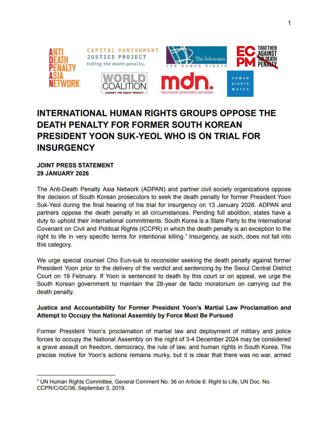 - The Seoul Central District Court exercise heightened restraint at sentencing, in line with South Korea’s international human rights obligations and its long-standing non-use of the death penalty; and