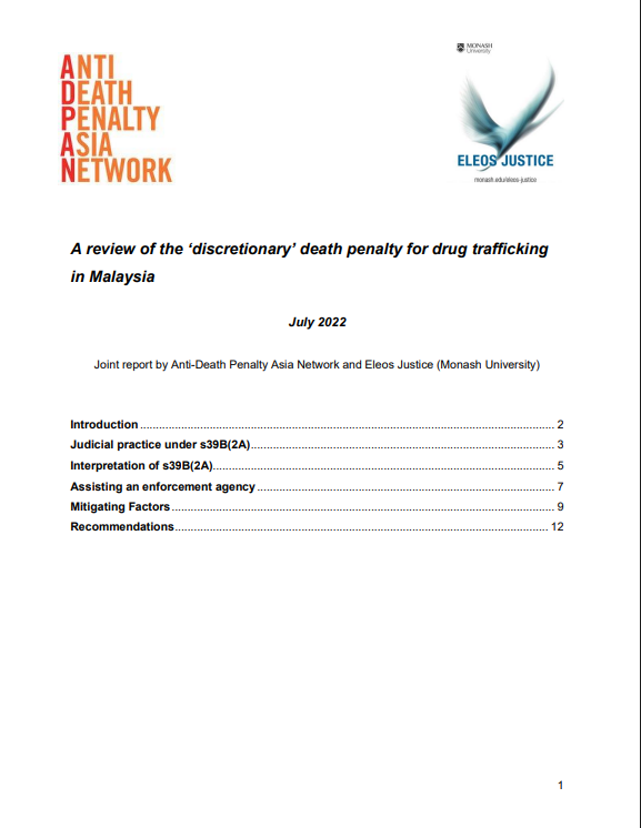 This briefing note prepared by the Anti-Death Penalty Asia Network (ADPAN) and Eleos Justice at Monash University outlines the current judicial practice concerning s39B(2A), highlights reasons behind the lack of discretion afforded to judges and other problems with the provisions, and proposes amendments to remedy these shortcomings, including the removal of the death penalty for drug trafficking.