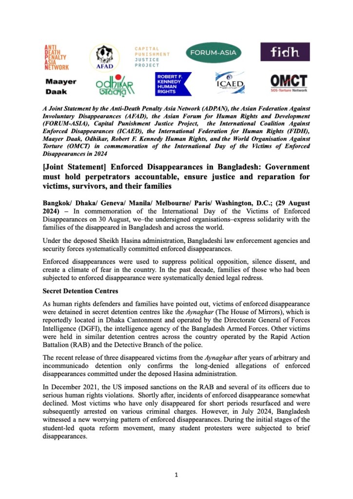 Bangkok/ Dhaka/ Geneva/ Manila/ Melbourne/ Paris/ Washington, D.C.; (29 August 2024) – In commemoration of the International Day of the Victims of Enforced Disappearances on 30 August, we–the undersigned organisations–express solidarity with the families of the disappeared in Bangladesh and across the world.