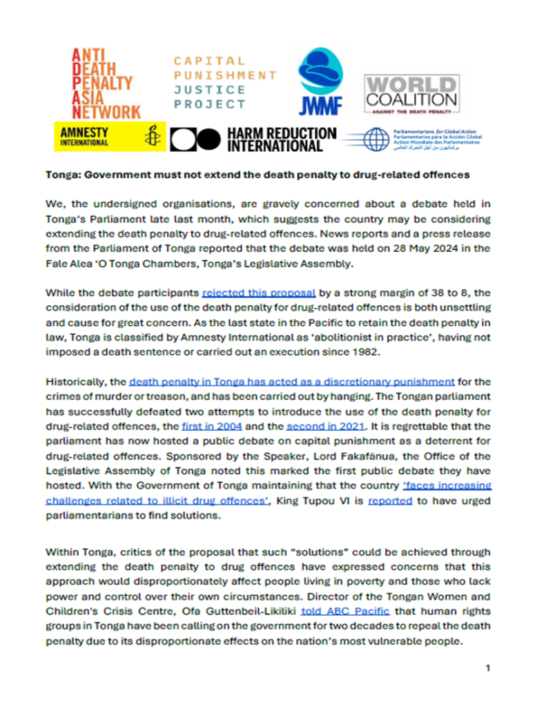 We, the undersigned organisations, are gravely concerned about a debate held in Tonga’s Parliament late last month, which suggests the country may be considering extending the death penalty to drug-related offences. News reports and a press release from the Parliament of Tonga reported that the debate was held on 28 May 2024 in the Fale Alea ‘O Tonga Chambers, Tonga’s Legislative Assembly.