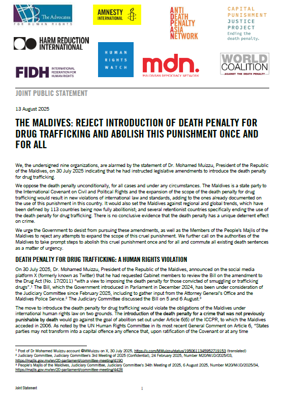 We, the undersigned nine organizations, are alarmed by the statement of Dr. Mohamed Muizzu, President of the Republic of the Maldives, on 30 July 2025 indicating that he had instructed legislative amendments to introduce the death penalty for drug trafficking.