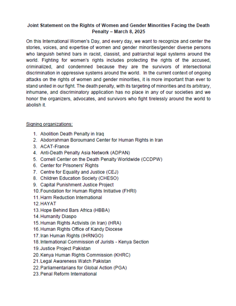 Joint Statement on the Rights of Women and Gender Minorities Facing the Death Penalty