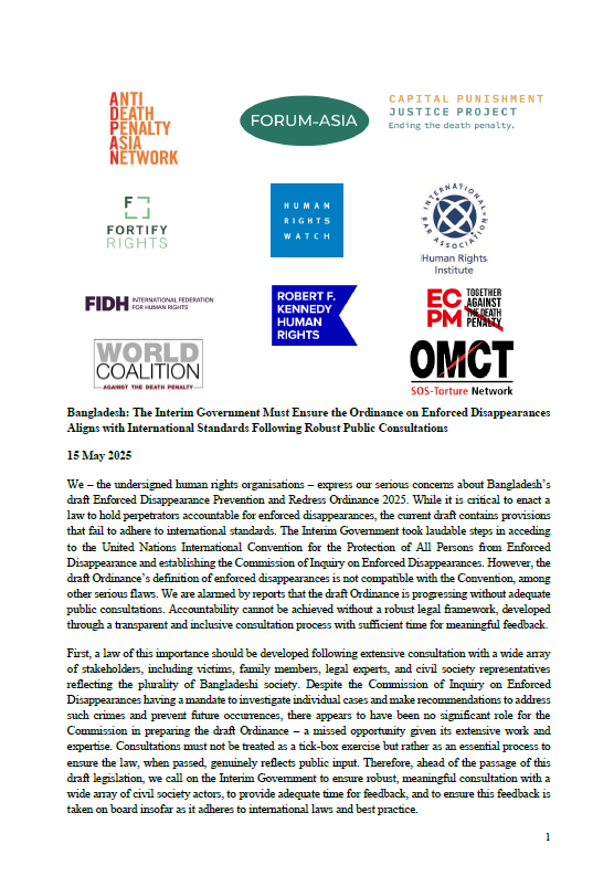 We – the undersigned human rights organisations – express our serious concerns about Bangladesh’s draft Enforced Disappearance Prevention and Redress Ordinance 2025. While it is critical to enact a law to hold perpetrators accountable for enforced disappearances, the current draft contains provisions that fail to adhere to international standards. The Interim Government took laudable steps in acceding to the United Nations International Convention for the Protection of All Persons from Enforced Disappearance and establishing the Commission of Inquiry on Enforced Disappearances. However, the draft Ordinance’s definition of enforced disappearances is not compatible with the Convention, among other serious flaws. We are alarmed by reports that the draft Ordinance is progressing without adequate public consultations.