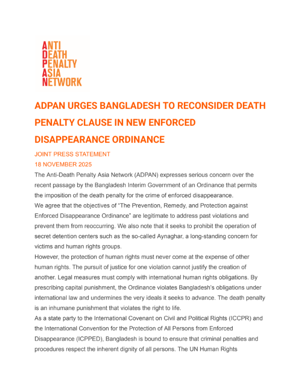The Anti-Death Penalty Asia Network (ADPAN) expresses serious concern over the recent passage by the Bangladesh Interim Government of an Ordinance that permits the imposition of the death penalty for the crime of enforced disappearance. We agree that the objectives of “The Prevention, Remedy, and Protection against Enforced Disappearance Ordinance” are legitimate to address past violations and prevent them from reoccurring. We also note that it seeks to prohibit the operation of secret detention centers such as the so-called Aynaghar, a long-standing concern for victims and human rights groups.